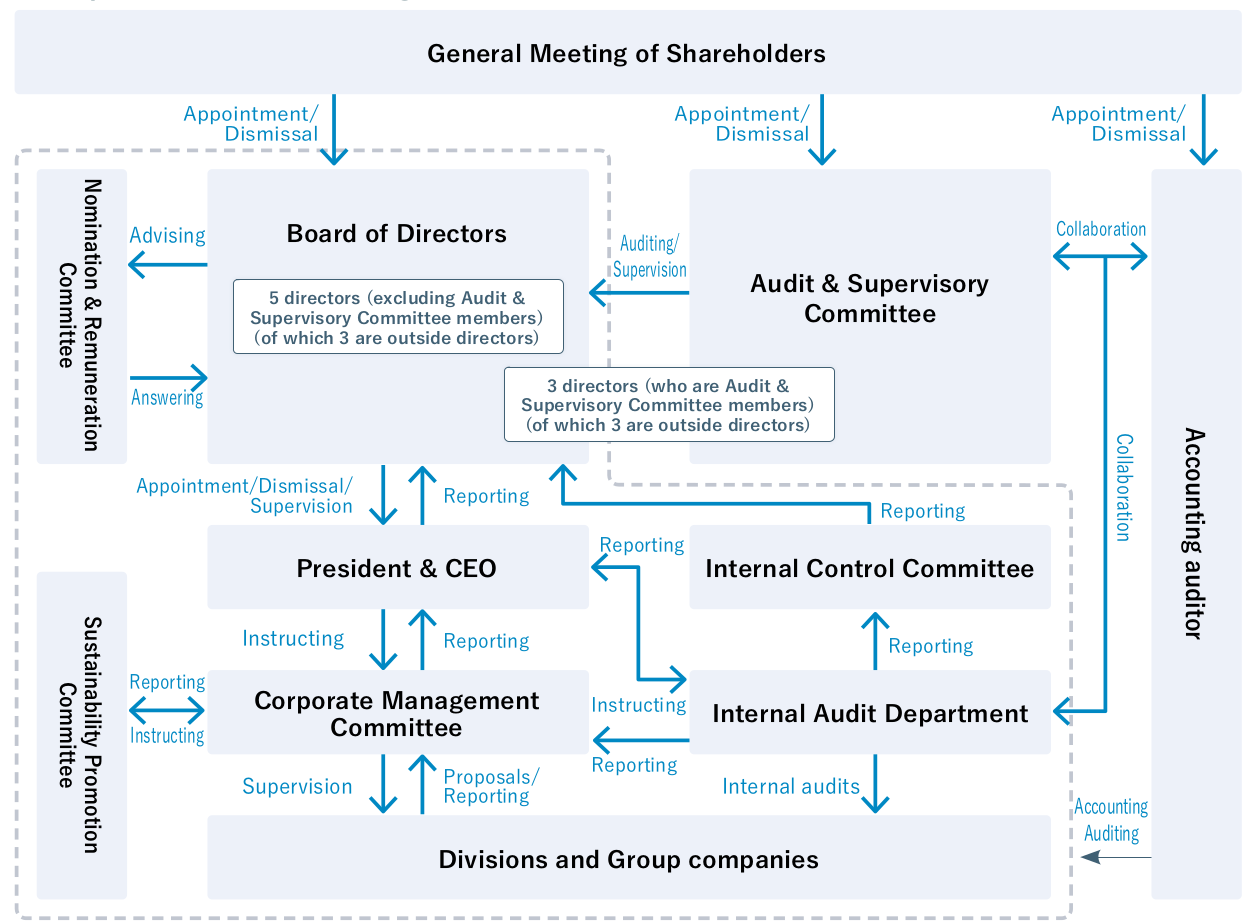 Our company has adopted the structure of a company with an Audit and Supervisory Committee. By establishing an audit and supervisory system for the Audit and Supervisory Committee and increasing the composition and diversity of outside directors on the Board of Directors, we believe that this system (monitoring model) can accelerate decision-making regarding business execution by enhancing the transparency and objectivity of the Board of Directors and further strengthening corporate governance, as well as by promoting the separation of business execution and supervision and delegating authority to executive officers overseen by the Representative Director and President.