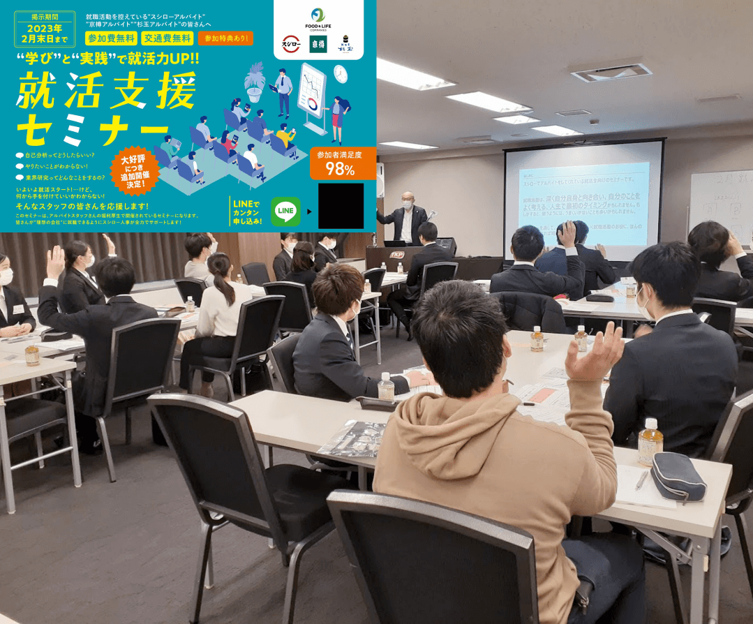 学生アルバイトを対象とした福利厚生のひとつに、「就活ワークショップ」があります。役員や採用担当者が講師となり、業界分析・自己分析・面接対策・アルバイト経験を就職活動に活かす方法等、様々なテーマでワークショップを開催しています。アルバイトを卒業後に、ご本人が輝ける会社で社会人生活をスタートできるよう、学生アルバイトの就職活動を全力でサポートします。