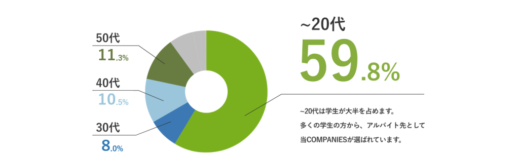 COMPANIESで働いているパート・アルバイトの中で最も多いのが学生の方です。店舗は土日や夕方以降が特に忙しいため、学生の方が働きやすい時間にシフトに入ることができます。シフトを柔軟に変更することができるので、学業や部活と両立でき、長く続けることができます。先輩スタッフが丁寧にレクチャーしているので、未経験の方でも安心して、アルバイトを始めることができます。