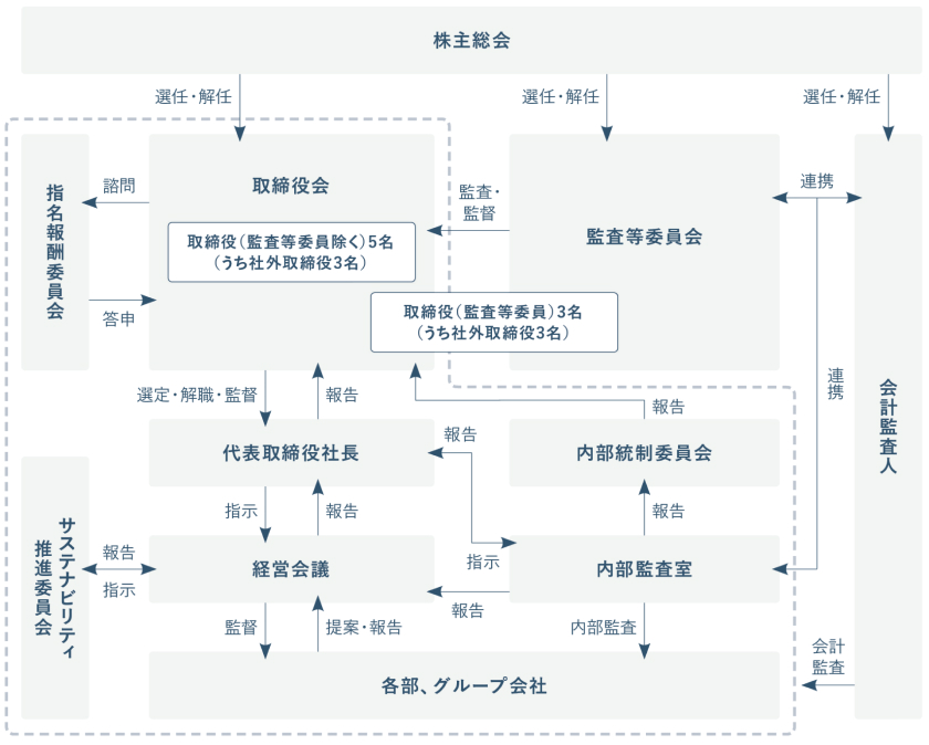 加えて、当社グループはサステナビリティをグループ全体の経営課題として明確に位置づけ、サステナビリティに対する取組みを推進するために、 代表取締役社長を委員長とするサステナビリティ推進委員会を設置しております。サステナビリティ推進委員会は、 経営会議に対し気候変動対応を含むサステナビリティに関する状況を適宜報告し、指示・助言を受けることとしています。 さらに、代表取締役社長は必要に応じてそれらの状況を適宜取締役会に報告いたします。