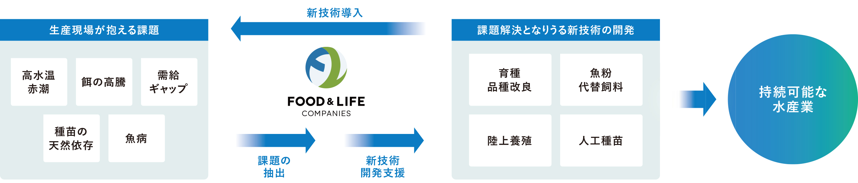 地球温暖化に伴う海洋環境の変化によって天然漁獲量の減少が危惧される中、天然資源に依存しない水産資源調達の重要性が増しています。その対応策として、外部事業者や先端技術への投資、業務提携による種苗開発や飼料の改良・代替などの新技術の開発に取り組んでいます。こうした川上事業での調達基盤の強化により、安定した品質と生産量の確保を目指します。